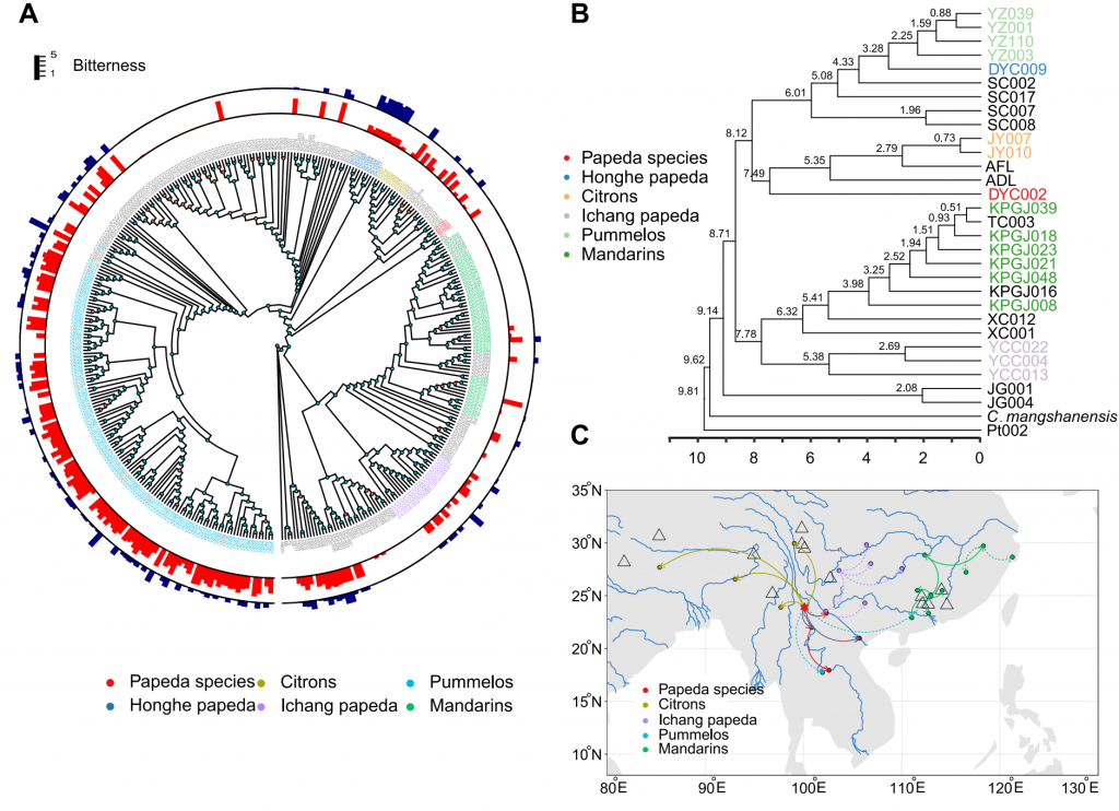 柑橘是世界上種植最廣泛的水果之一,目前在140多個國家和地區(qū)種植。雖然過去的二十年里柑橘植物的種群結(jié)構(gòu)和遺傳多樣性已被調(diào)查,但由于其豐富的資源類型和雜交頻繁,許多柑橘物種的起源和進化仍不清楚。野生柑橘物種和原始柑橘保存了豐富的遺傳資源和遺傳多樣性,可用于闡明柑橘物種的起源和進化。2015年,在西雙版納發(fā)現(xiàn)一棵200多年的野生柑橘樹大翼葉柑橘(DYC002),被認為是研究柑橘進化及苦味馴化的很好材料。