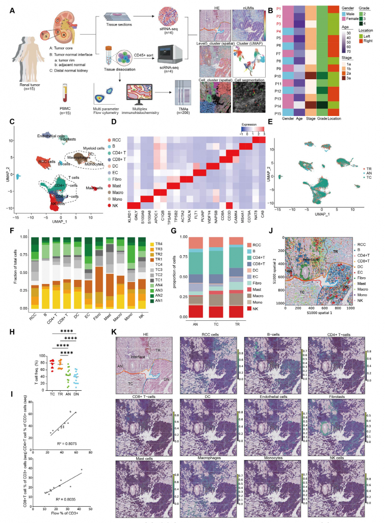 組別設計:實驗組4名ccRCC患者樣本進行單細胞轉(zhuǎn)錄組測序&空間轉(zhuǎn)錄組測序,驗證組15名ccRCC患者樣本進行流式細胞術&多重免疫熒光染色,151名ccRCC患者組織樣本&40名其他腎癌亞型患者組織樣本&6名捐獻者健康腎組織進行多重熒光免疫組化染色。