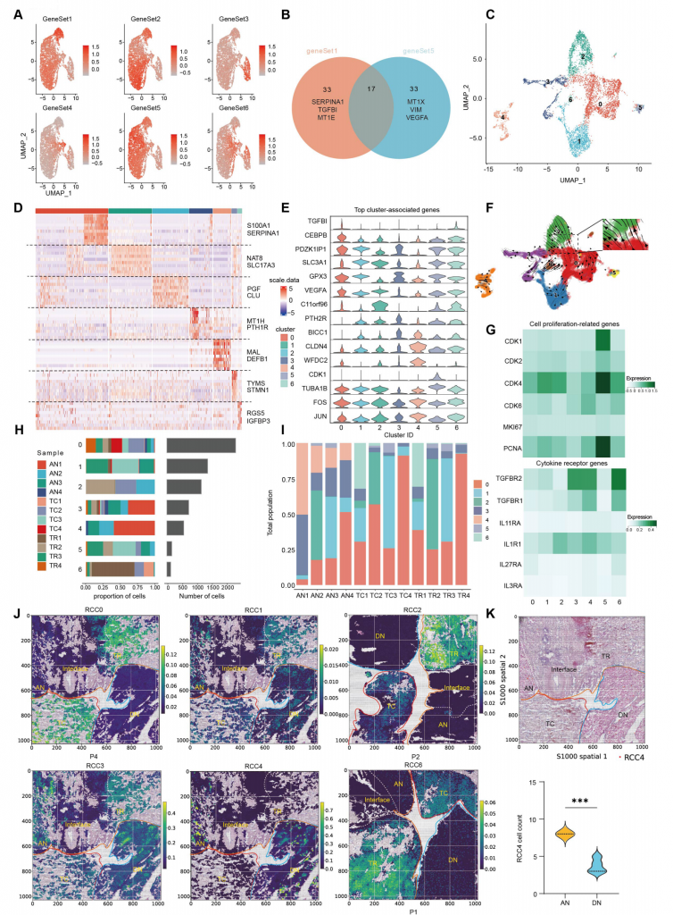 進一步分析,發(fā)現(xiàn)ccRCC亞群0~4簇與不同基因集表達譜匹配,5和6簇不與任何基因集匹配但具有細胞周期和應激響應相關基因表達。RCC0簇和RCC2簇代表EMThigh腫瘤細胞并在IF區(qū)域富集,RCC1簇代表PT(近曲小管)細胞,擬時序分析結果顯示存在RCC0—>RCC2分化關系,但RCC2幾乎只在P2患者樣本中發(fā)現(xiàn),表明RCC2可能與個別患者特征相關。RCC1、RCC3和RCC4細胞主要在組織而不是腫瘤區(qū)域富集,RCC4主要分布在AN和DN區(qū)域,RCC4在AN區(qū)域分布數(shù)量高于DN區(qū)域。RCC4高表達細胞因子受體基因,表明TME中分泌的促腫瘤細胞因子可能傾向于作用到RCC4,增加其轉(zhuǎn)變成癌細胞的概率,加速腫瘤逃逸,促進腫瘤惡性化,與以往瘤旁附近不是完全的健康組織認識相符合。
