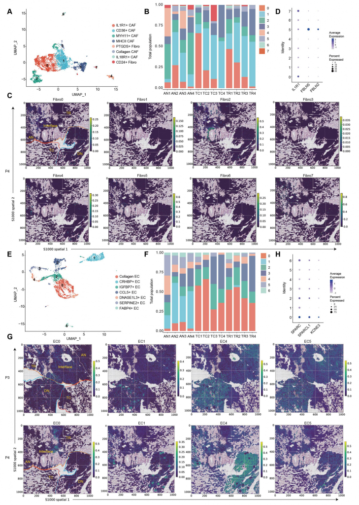 scRNA-seq與空間數(shù)據(jù)均顯示,ccRCC存在8種激活的成纖維細胞簇,腫瘤區(qū)域成纖維細胞數(shù)量高于健康組織,其中CD24+IL32+成纖維細胞顯著富集在腫瘤區(qū)域,PTGDS+成纖維細胞幾乎全分布在AN,高表達ECM(胞外基質(zhì))形成和EMT的成纖維細胞簇在IF較為富集,IL1R1+?CAF(腫瘤相關成纖維細胞)表現(xiàn)出腫瘤促進表型;7種EC(內(nèi)皮細胞)簇中4種(0,2,3和6)主要富集在腫瘤組織,3種(1,4和5)在健康組織富集,膠原蛋白EC(0簇)豐度最高,具有促腫瘤特征??傊?,不同的ECM蛋白質(zhì)產(chǎn)生基質(zhì)細胞傾向于富集在IF并共定位,可能行駛多種功能,包括細胞-細胞交互和胞外組分重構。