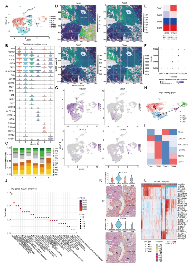 scRNA-seq數(shù)據(jù)與空間數(shù)據(jù)均顯示,4種TAM簇具有不同分布趨勢,TAM1主要分布在TC區(qū)域;TAM2高表達FOLR2、MRC1和CD163,可能是M2樣巨噬細胞且具有增強的免疫抑制特征,TAM4是組織駐留巨噬細胞,兩者主要分布在TR區(qū)域;TAM3表達炎癥響應相關基因,在TR和AN區(qū)域富集。RNA速率分析顯示存在TAM4—>TAM2—>TAM1和TAM4—>TAM3兩種軌跡,以及從IF區(qū)域遷移到TC區(qū)域的趨勢。進一步的功能分析顯示,IF區(qū)域的TAM2可能通過促進EMT,TC區(qū)域的TAM2可能通過促進腫瘤血管生成,起到促癌效應。總之,TAM2不同的腫瘤促進效應可能與免疫抑制TME有關。