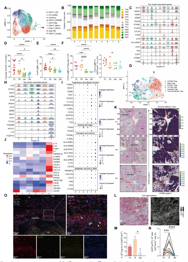 進一步分析CD4+ T細胞簇,發(fā)現(xiàn)存在CD4+ 初始T細胞、Treg和濾泡樣輔助T細胞,不同簇的特征基因和空間分布模式不同,IF區(qū)域富集CD4+ 初始T細胞和PDE3B+ CD4+ T細胞,腫瘤區(qū)域富集Treg。其中,TC/TR區(qū)域CTLA-4+?Treg的占比以及Treg的FoxP3蛋白表達水平高于AN/DN區(qū)域,而CTLA-4+FoxP3-?Treg在所有組織中的分布較為均勻,表明腫瘤區(qū)域Treg細胞具有更強的免疫抑制功能。