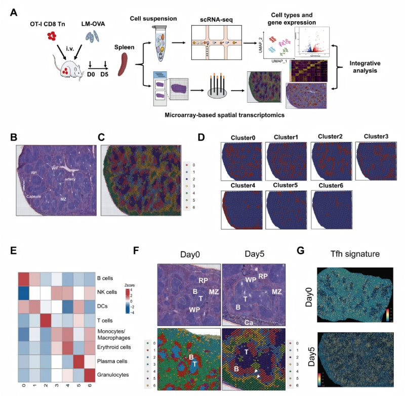 為了研究免疫反應過程中不同免疫細胞的空間分布和CD8+?T細胞分化的調節(jié)機制,研究人員通過整合單細胞RNA測序(scRNA-seq)和BMKMANU?S1000空間轉錄組(ST)技術,分析了急性感染模型中脾臟免疫細胞的空間分布與CD8??T細胞分化機制。實驗采用OT-I轉基因小鼠模型,通過李斯特菌(LM-OVA)感染誘導免疫反應,關鍵發(fā)現包括:1)脾臟形成7個功能集群(B細胞、T細胞、單核/巨噬細胞等);2)感染后T/B細胞區(qū)擴大,APCs(B細胞、DC、巨噬細胞)在T細胞區(qū)外圍聚集;3)空間重組與T細胞分化(MP/TE亞群)顯著相關。多組學整合揭示了免疫微環(huán)境的動態(tài)調控機制,為理解感染中細胞互作提供了多組學視角。