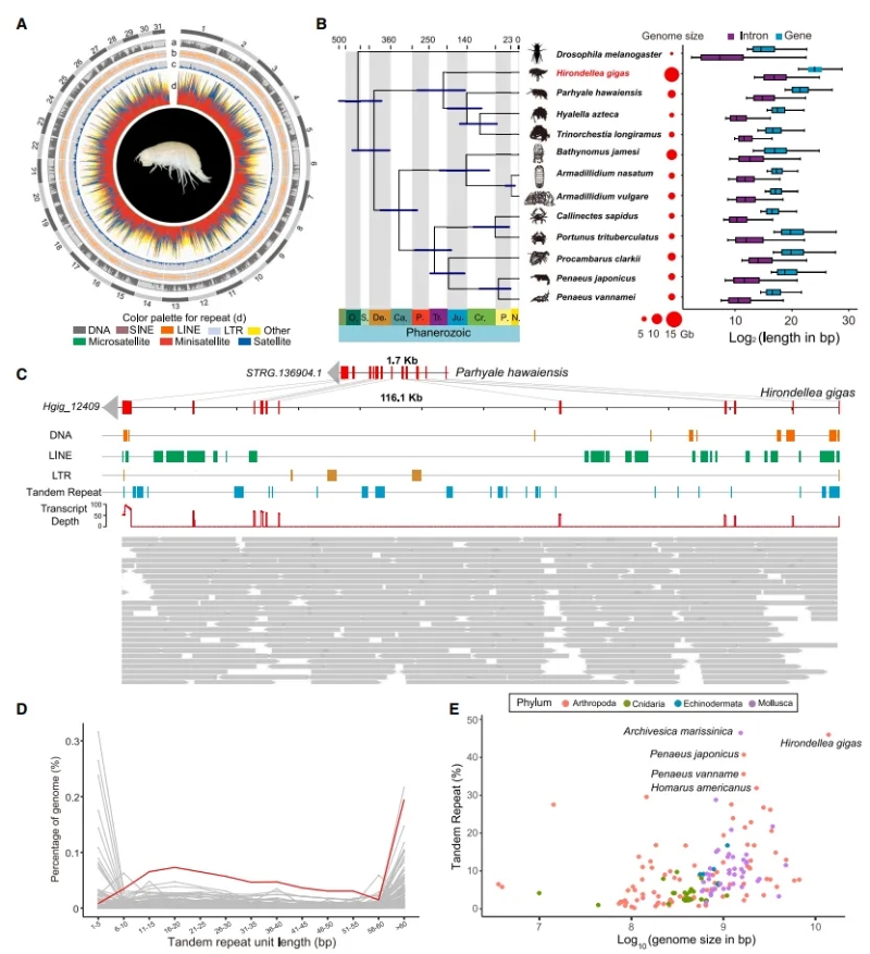 研究團(tuán)隊(duì)利用PacBio?HiFi長(zhǎng)讀長(zhǎng)測(cè)序和Hi-C三維基因組技術(shù),成功組裝了H.?gigas的染色體水平的高質(zhì)量基因組(大小13.92?Gb)。基因組分析揭示了其兩大主要特征:內(nèi)含子延長(zhǎng)和重復(fù)序列擴(kuò)張。與近緣物種相比,H.?gigas的內(nèi)含子長(zhǎng)度顯著增加,主要是由于重復(fù)序列的插入,尤其是串聯(lián)重復(fù)和長(zhǎng)散在重復(fù)序列(LINEs)轉(zhuǎn)座子。H.?gigas基因組中71.98%為重復(fù)序列,主要為串聯(lián)重復(fù),占到基因組的46.03%,顯著高于其他無(wú)脊椎動(dòng)物。特別是,與其他無(wú)脊椎動(dòng)物基因組相比,H.?gigas基因組中長(zhǎng)單元串聯(lián)重復(fù)序列(小衛(wèi)星,10-100?bp)的比例更高,其比例與無(wú)脊椎動(dòng)物基因組大小正相關(guān)。這些重復(fù)的產(chǎn)生可能與深淵極端環(huán)境的適應(yīng)有關(guān)。