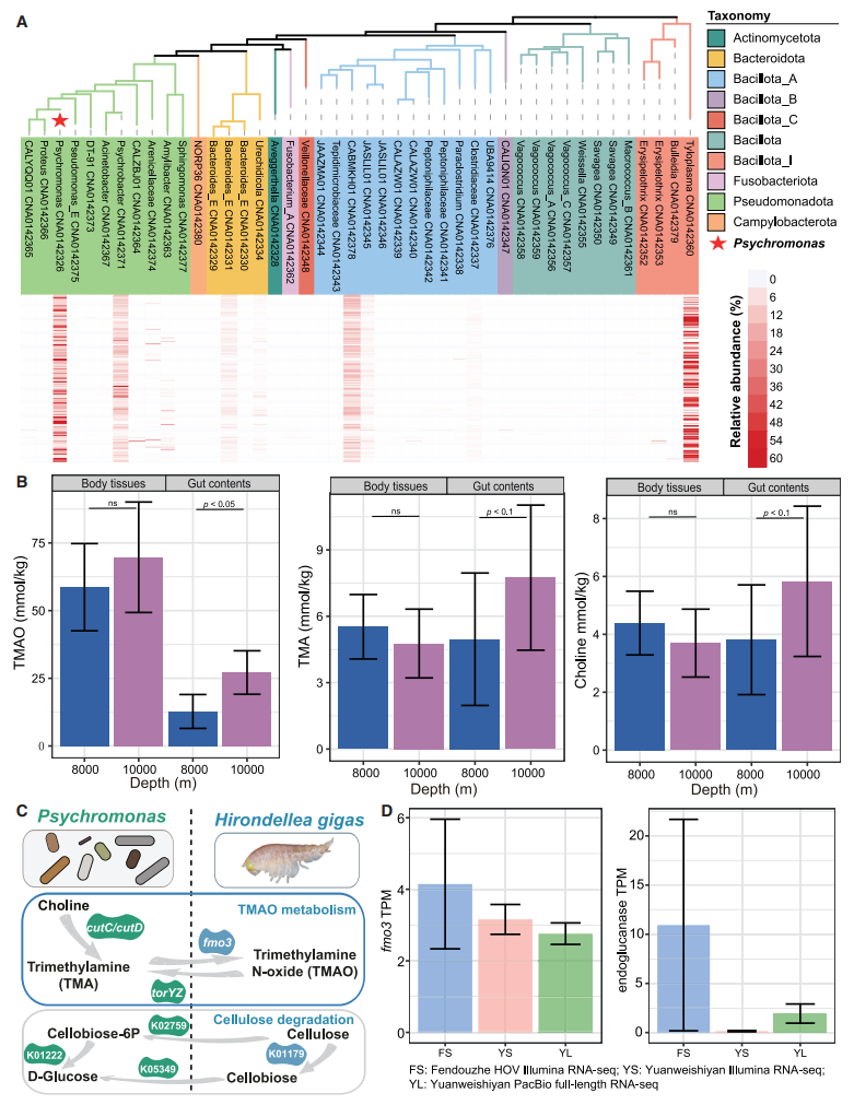 氧化三甲胺(TMAO)是一種滲透調(diào)節(jié)物質(zhì),在滲透壓調(diào)節(jié)以及在高靜水壓條件下維持細(xì)胞完整性方面發(fā)揮著重要作用。檢測(cè)發(fā)現(xiàn),隨著深度增加,鉤蝦腸道內(nèi)容物中TMAO濃度顯著升高,體組織中也呈現(xiàn)類(lèi)似趨勢(shì)。鉤蝦自身編碼fmo3基因,可將三甲胺(TMA)轉(zhuǎn)化為T(mén)MAO。而其優(yōu)勢(shì)共生菌Psychomonas的基因組中攜帶cutC和cutD基因簇,可將膽堿分解為T(mén)MA;同時(shí)擁有torYZ操縱子,可以將TMAO還原為T(mén)MA,從而調(diào)控宿主體內(nèi)的TMAO濃度,形成動(dòng)態(tài)平衡。