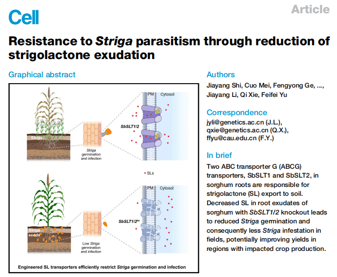 中國(guó)科學(xué)院遺傳與發(fā)育生物學(xué)研究所/玉米等作物種質(zhì)創(chuàng)新及分子育種全國(guó)重點(diǎn)實(shí)驗(yàn)室主任謝旗研究員課題組、中國(guó)農(nóng)業(yè)大學(xué)于菲菲教授課題組以及中國(guó)科學(xué)院遺傳與發(fā)育生物學(xué)研究所/崖州灣國(guó)家實(shí)驗(yàn)室李家洋院士課題組合作在Cell雜志在線(xiàn)發(fā)表研究論文,題為“Resistance?to?Striga?Parasitism?through?Reduction?of?Strigolactone?Exudation”。