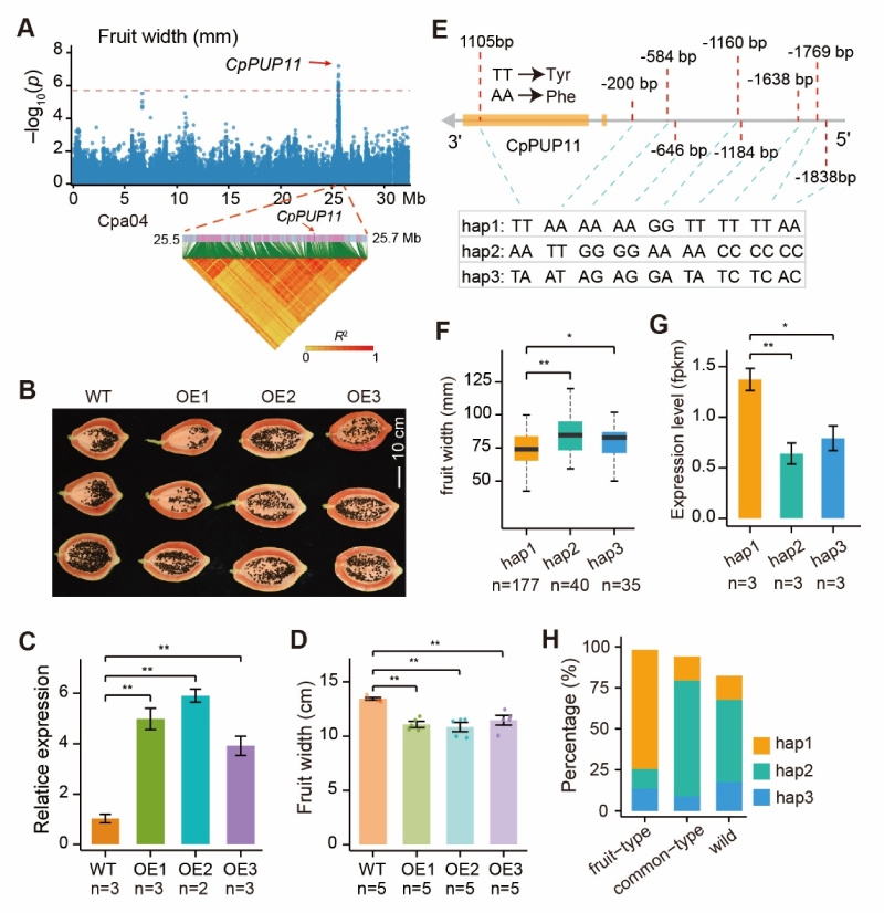 圖1. CpPUP11決定番木瓜果實寬度
