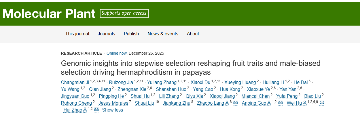 2025年12月23日,中國熱科院生物所、熱帶作物生物育種全國重點實驗室聯(lián)合南方科技大學(xué)、中科院分子植物科學(xué)卓越創(chuàng)新中心、中國科學(xué)院大學(xué)、熱科院椰子所、Nature?Source?Improved?Plants,?Mexico和百邁客生物等國內(nèi)外科研單位在中科院1區(qū)Top期刊Molecular?Plant(影響因子:24.1)發(fā)表了題為“Genomic?insights?into?stepwise?selection?reshaping?fruit?traits?and?male-biased?selection?driving?hermaphroditism?in?papayas”的最新研究論文,其中百邁客生物生信工程師戴鶴為該論文共同作者。