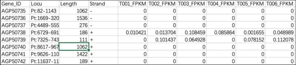 第一列為基因ID,?第五列及以后為各個(gè)樣本的表達(dá)量數(shù)據(jù),數(shù)值以FPKM表示。