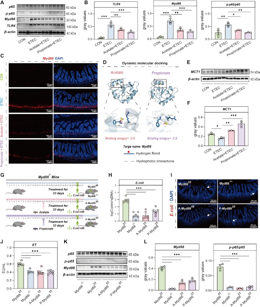機(jī)制研究發(fā)現(xiàn),大腸桿菌感染可顯著激活仔豬、小鼠及IPEC-J2腸上皮細(xì)胞中?TLR4-MyD88-NF-κB信號通路,上調(diào)TLR4、MyD88、p65蛋白及基因表達(dá),而海氏腸球菌、乙酸?/?丙酸干預(yù)可顯著逆轉(zhuǎn)該通路的異常激活。分子對接實驗證實,乙酸和丙酸可與MyD88蛋白直接結(jié)合,結(jié)合位點為PHE-285和ARG288,其中乙酸與MyD88的PHE-285形成氫鍵,結(jié)合親和力更強(qiáng)。乙酸和丙酸可上調(diào)大腸桿菌感染小鼠回腸組織單羧酸轉(zhuǎn)運蛋白1(MCT1)表達(dá),而海氏腸球菌可顯著升高感染仔豬回腸SLC16A1(編碼?MCT1)基因表達(dá),提示SCFAs需通過MCT1轉(zhuǎn)運進(jìn)入細(xì)胞發(fā)揮作用。構(gòu)建腸道上皮細(xì)胞特異性MyD88敲除(Myd88?/?)小鼠模型,證實敲除MyD88可達(dá)到與乙酸?/?丙酸干預(yù)相似的效果,顯著抑制大腸桿菌定植、降低血清ET水平、緩解腸道炎癥,證實乙酸?/?丙酸通過靶向MyD88-NF-κB通路發(fā)揮抗炎作用。