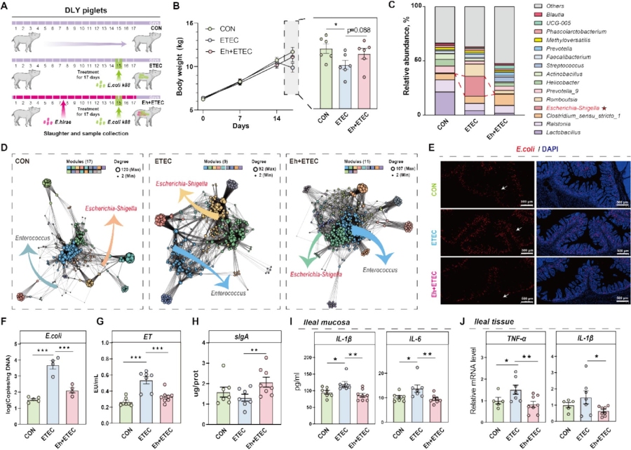 寧鄉(xiāng)豬源海氏腸球菌抑制大腸桿菌定植并改善腸道炎癥體外抑菌實驗顯示,該海氏腸球菌對大腸桿菌、沙門氏菌、金黃色葡萄球菌均有抑制作用,其中對大腸桿菌抑制效果最顯著。構(gòu)建大腸桿菌誘導(dǎo)的仔豬腸道炎癥模型,將24日齡DLY仔豬分為對照組(CON)、大腸桿菌感染組(ETEC)、海氏腸球菌干預(yù)+大腸桿菌感染組(Eh+ETEC)。結(jié)果顯示,海氏腸球菌可逆轉(zhuǎn)大腸桿菌誘導(dǎo)的仔豬體重下降,16S?rRNA基因測序表明其能恢復(fù)感染仔豬腸道菌群α、β多樣性,降低變形菌門豐度,提升梭菌屬、普雷沃氏菌屬等有益菌豐度,顯著降低埃希氏?–?志賀氏菌屬的相對豐度和定植量。菌群網(wǎng)絡(luò)分析顯示,海氏腸球菌可恢復(fù)被大腸桿菌破壞的微生物群落穩(wěn)定性,提升腸球菌屬的生態(tài)地位。同時,該菌株能顯著降低仔豬血清腸毒素(ET)水平,恢復(fù)回腸sIgA水平,降低回腸黏膜促炎細(xì)胞因子IL-1β、IL-6含量及TNF-α、IL-1β基因表達(dá),有效緩解大腸桿菌誘導(dǎo)的腸道炎癥和腸屏障損傷。