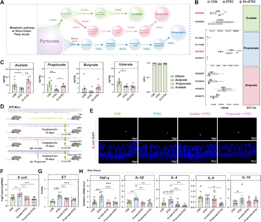 功能預(yù)測分析顯示,海氏腸球菌可調(diào)控丙酮酸代謝通路,全基因組測序證實其攜帶乙酸、丙酸合成相關(guān)基因(K00926、K0184)。仔豬實驗發(fā)現(xiàn),大腸桿菌感染顯著降低回腸食糜中乙酸、丙酸、戊酸濃度,而海氏腸球菌干預(yù)可特異性升高乙酸和丙酸水平(丁酸水平無顯著變化),且寧鄉(xiāng)仔豬糞便中乙酸、丙酸濃度顯著高于約克夏仔豬。構(gòu)建乙酸?/?丙酸干預(yù)的大腸桿菌感染小鼠模型,證實乙酸和丙酸可顯著抑制大腸桿菌在小鼠回腸的黏附與定植,降低血清ET、DAO水平,減輕腸道形態(tài)損傷,且丙酸的作用效果更顯著;同時可下調(diào)回腸組織TNF-α、IL-1β、IL-4、IL-6等促炎細(xì)胞因子基因表達(dá),證實乙酸和丙酸是海氏腸球菌緩解腸道炎癥的關(guān)鍵后生元。
