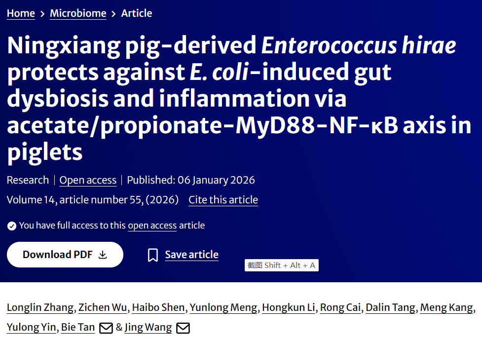 2026年1月6日,湖南農(nóng)業(yè)大學(xué)譚碧娥、王婧團(tuán)隊在《Microbiome》發(fā)表題為?“Ningxiang?pig-derived?Enterococcus?hirae?protects?against?E.?coli-induced?gut?dysbiosis?and?inflammation?via?acetate/propionate-MyD88-NF-κB?axis?in?piglets”?的研究性論文。