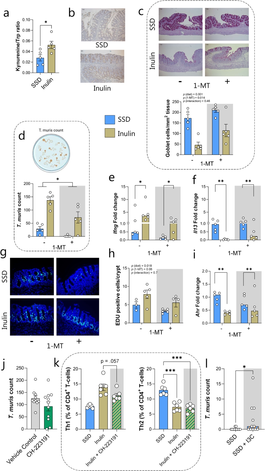 菊粉感染小鼠血清犬尿氨酸/色氨酸比值升高,結(jié)腸IDO1表達(dá)增強。IDO1抑制劑1-MT部分恢復(fù)杯狀細(xì)胞增生、降低蟲荷。在正常飼料中添加AhR激動劑前體I3C,可顯著增加蟲荷,提示AhR激活參與菊粉效應(yīng)。