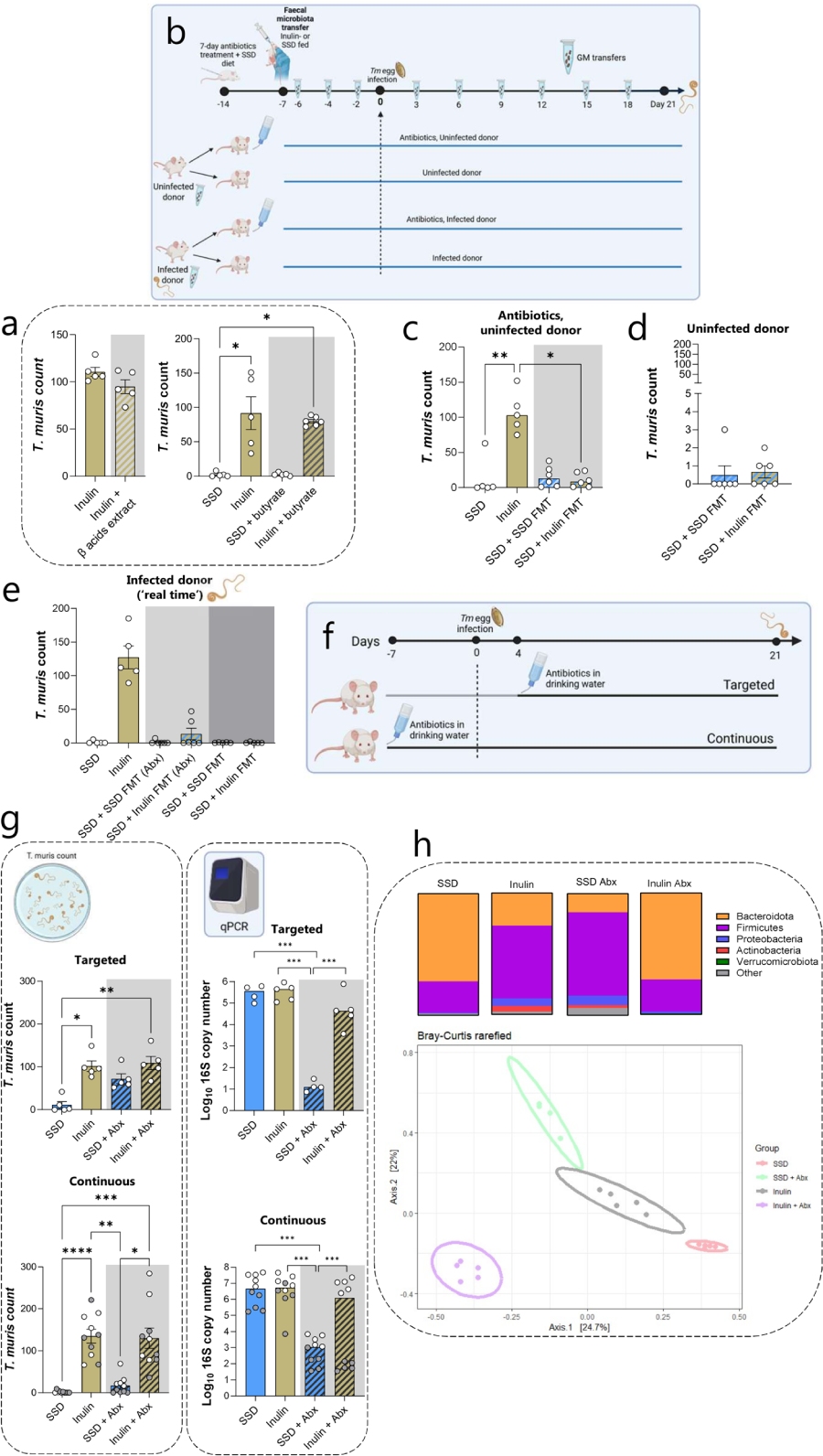 研究團隊前期發(fā)現(xiàn),在純化飼料中添加10%菊粉可顯著增加鼠鞭蟲荷爾蒙,伴隨1型炎癥偏斜【J?Immunol?2020】。傳統(tǒng)觀點認(rèn)為,可發(fā)酵纖維的免疫調(diào)節(jié)作用主要通過改變菌群組成及代謝產(chǎn)物(如短鏈脂肪酸)實現(xiàn)。然而,菊粉是否通過菌群依賴或非依賴途徑影響抗寄生蟲免疫,機制尚不明確。