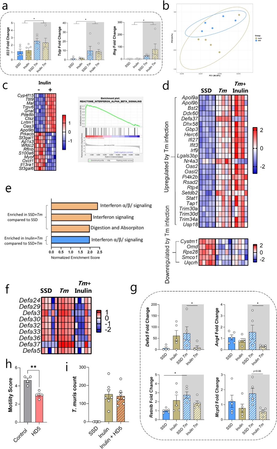 根據(jù)轉(zhuǎn)錄組篩選及qPCR進(jìn)一步檢測結(jié)果發(fā)現(xiàn)感染后第3天,正常飼料小鼠腸上皮顯著上調(diào)α-防御素、Ang4、Retnlb等抗微生物效應(yīng)分子;而菊粉喂養(yǎng)小鼠中,這些關(guān)鍵分子的誘導(dǎo)被完全阻斷,表明菊粉導(dǎo)致上皮先天應(yīng)答缺陷。