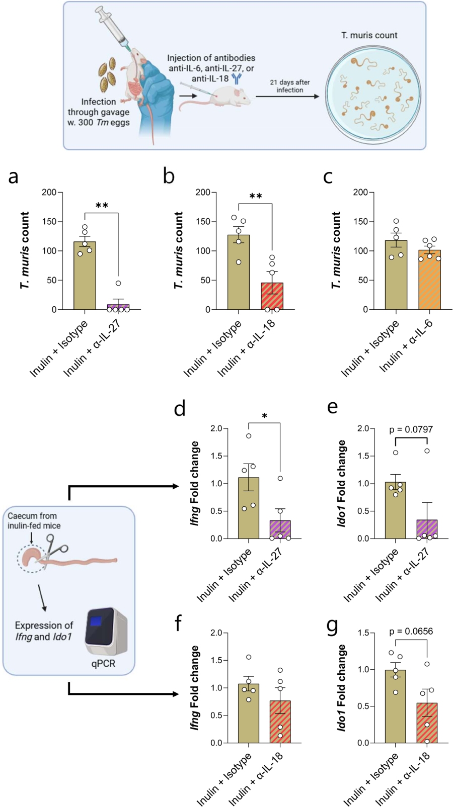 對感染早期中和關(guān)鍵細(xì)胞因子發(fā)現(xiàn):抗IL-27抗體幾乎完全恢復(fù)蟲體清除能力;抗IL-18抗體顯著降低;蟲荷抗IL-6無效。表明IL-27和IL-18通過促進(jìn)1型炎癥及色氨酸分解代謝,抑制保護(hù)性2型免疫。