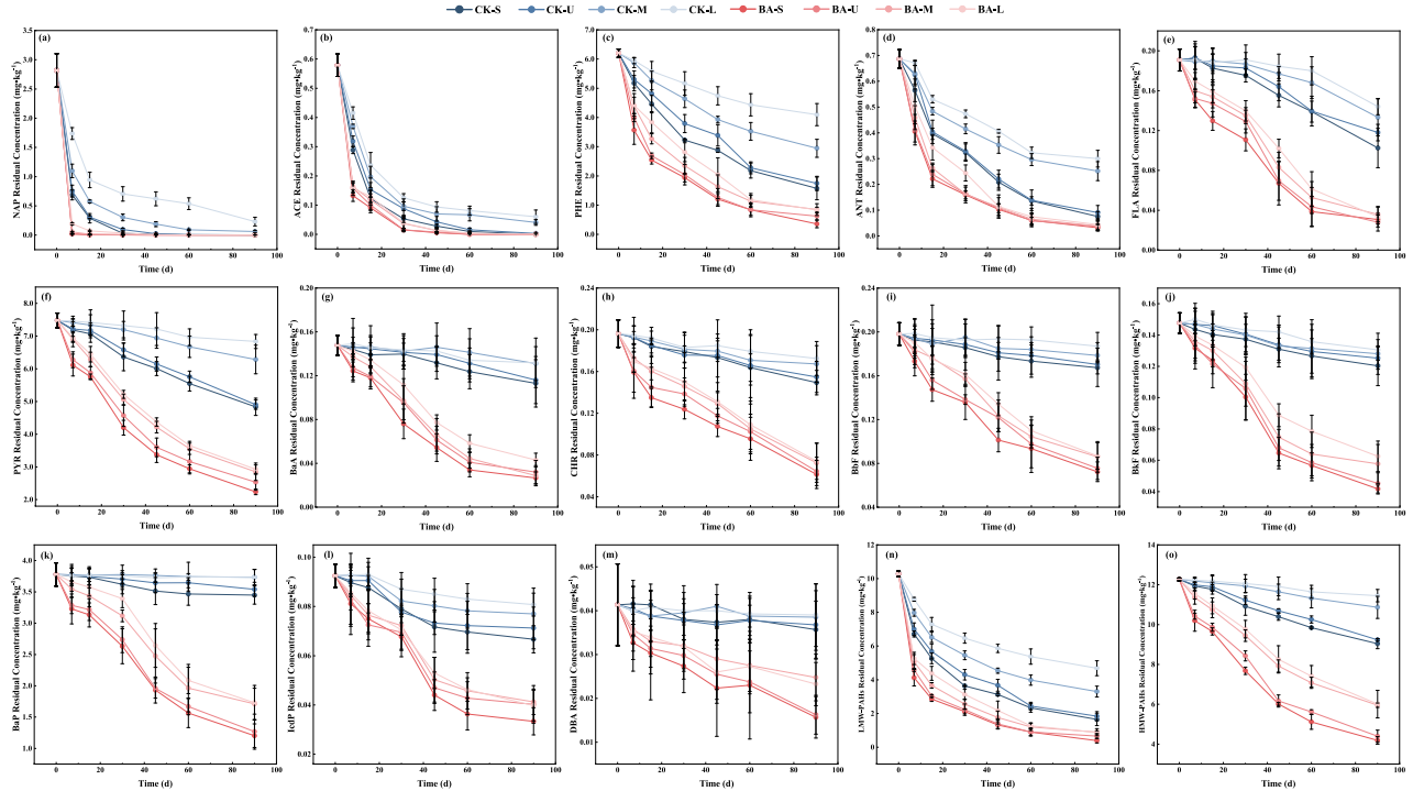 • 對(duì)比 BA 組與 CK 組 90 天內(nèi) 16 種 PAHs 及低 / 高分子量 PAHs 在不同土壤層的殘留變化,量化高濃度污染物的去除效率與降解速率差異。