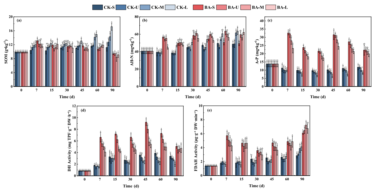 • 為評(píng)估生物修復(fù)期間的地球化學(xué)響應(yīng),對(duì) CK 對(duì)照組和 BA 處理組 90 天內(nèi)的土壤有機(jī)質(zhì)(SOM)、堿解氮(AH-N)、有效磷(AP)、熒光素二乙酸酯(FDA)水解酶活性及脫氫酶(DH)活性進(jìn)行了監(jiān)測(cè)。