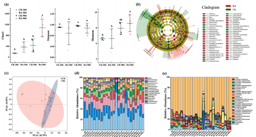 • 基于 16S rRNA 基因測(cè)序,分析兩組微生物群落多樣性、物種組成變化,聚焦功能降解菌富集特征與 BA 處理特異性標(biāo)志物。