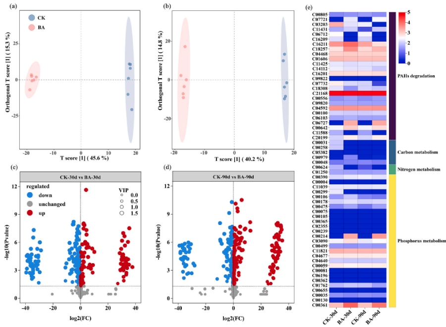 • 磷相關(guān)代謝物(胞苷 C00475、胸苷 C00214 等)全程富集,黃苷(C01762)僅第 30 天升高,這些代謝調(diào)整通過(guò)激活 PAHs 分解途徑和改善營(yíng)養(yǎng)循環(huán),提升了 BA 處理的生物修復(fù)效率。