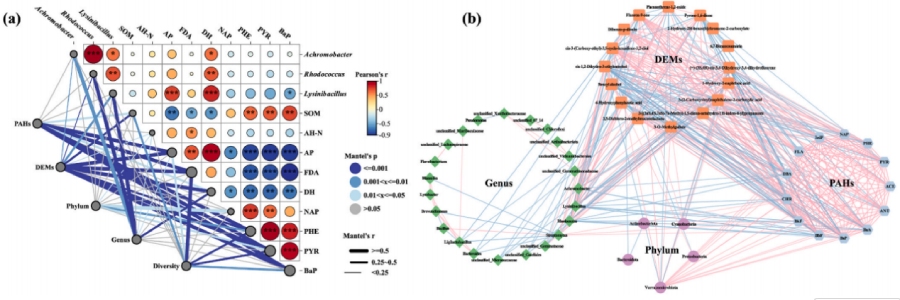 • 借助 Mantel 檢驗(yàn)與共現(xiàn)網(wǎng)絡(luò)分析,量化 PAHs 降解、微生物群落、代謝物及土壤環(huán)境因子間的相關(guān)性,闡明協(xié)同降解機(jī)制。