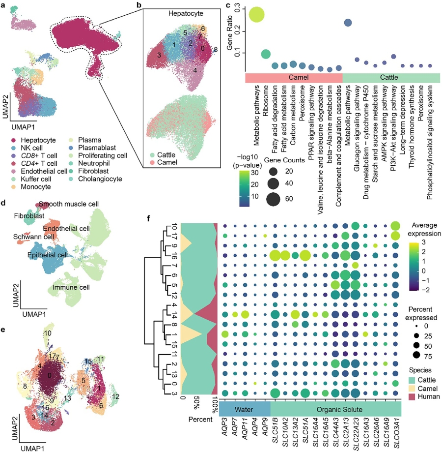 為評(píng)估前胃特化對(duì)植物性飼料利用的影響,作者提取了駱駝和牛的小腸及肝臟單細(xì)胞轉(zhuǎn)錄組數(shù)據(jù)進(jìn)行跨物種比較。