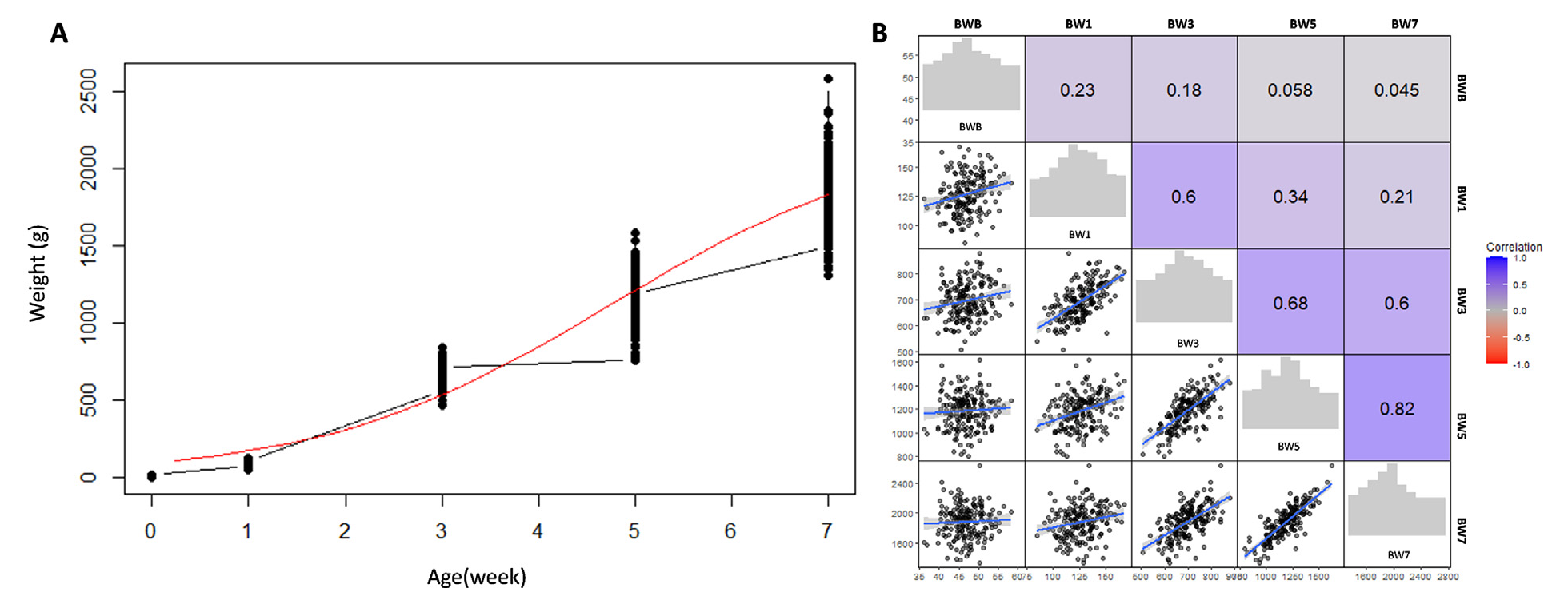該研究對(duì)金陵白鴨(n = 201)在不同時(shí)期的體重進(jìn)行統(tǒng)計(jì),BWB、BW1、BW3、BW5和BW7的體重均值分別為46.93g、127.19g、697.17g、1182.43g和1,888.52g。生長(zhǎng)曲線結(jié)果顯示:金陵白鴨第3周-第5周生長(zhǎng)最快,第5周后生長(zhǎng)放緩。體重的分散度隨著年齡和體重的增加而增加。相鄰2周的體重之間存在較強(qiáng)的相關(guān)性,BW3與BW1(r = 0.6)、BW5(r = 0.68)和BW7(r = 0.6)顯著正相關(guān),BW5與BW7顯著正相關(guān)(r = 0.82)。但隨著時(shí)間間隔的延長(zhǎng),性狀間的相關(guān)性降低,BW1與BW7的相關(guān)性不顯著(r = 0.21),BWB則與BW3 (r = 0.18), BW5 (r = 0.058),BW7 (r = 0.45)均不顯著相關(guān)。