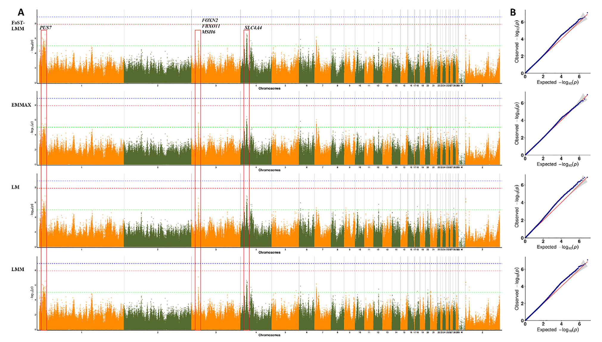 作者對(duì)出生體重(BWB)、1周體重(BW1)、3周體重(BW3)、5周體重(BW5)和7周體重(BW7)進(jìn)行了全基因組關(guān)聯(lián)分析,4種統(tǒng)計(jì)模型比較研究表明,F(xiàn)aST-LMM表現(xiàn)出最優(yōu)的效率,產(chǎn)生更多的結(jié)果和最小的假陽(yáng)性。