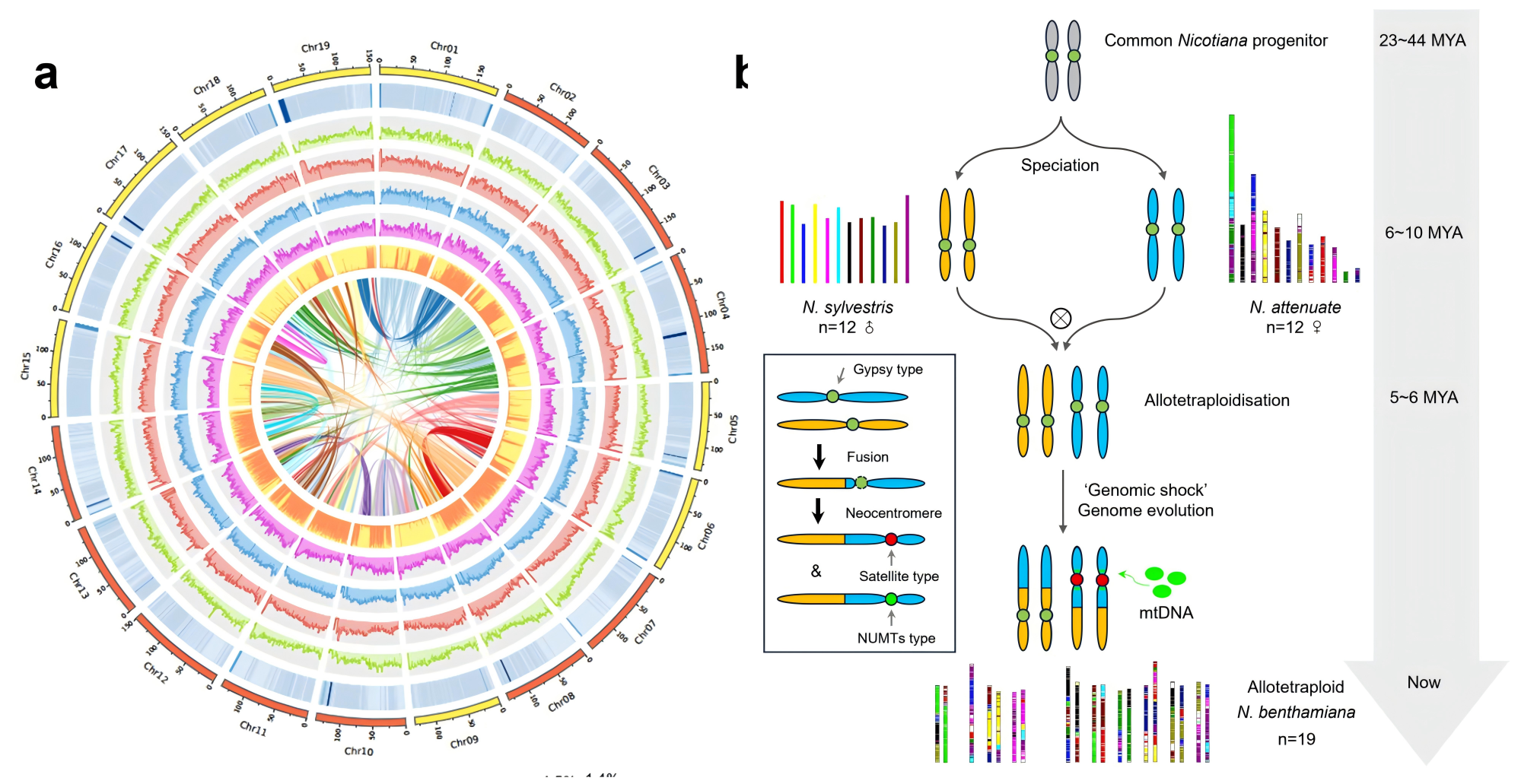 本氏煙草(Nicotiana benthamiana)是一年生茄科煙草屬植物,原產(chǎn)于澳大利亞北部地區(qū),和用于制作香煙的普通煙草(N. tabaccum)是近緣物種。本氏煙草最為人知的是作為植物學(xué)和合成生物學(xué)研究的模式植物。本氏煙草憑借其對(duì)病毒的易感性和在瞬時(shí)基因表達(dá)的便利性成為了植物科學(xué)家的“寵兒”,同時(shí)它也是植物天然產(chǎn)物和疫苗異源合成的重要底盤生物。因此,解析本氏煙草的基因組密碼對(duì)促進(jìn)植物科學(xué)研究和生物制藥產(chǎn)業(yè)具有重要的價(jià)值。本氏煙草是異源四倍體,由兩個(gè)二倍體祖先在距今500萬(wàn)年-600萬(wàn)年雜交形成,之后基因組演化形成現(xiàn)今的19對(duì)染色體。本氏煙草基因組約為2.85Gb,其草圖最早發(fā)表于2012年,之后的12年間多個(gè)改進(jìn)版本的本氏煙草基因組陸續(xù)公布,組裝質(zhì)量有了很大提升,但仍然存在多個(gè)缺口與組裝注釋錯(cuò)誤,嚴(yán)重影響了對(duì)這一模式生物的功能基因組學(xué)的研究進(jìn)程。