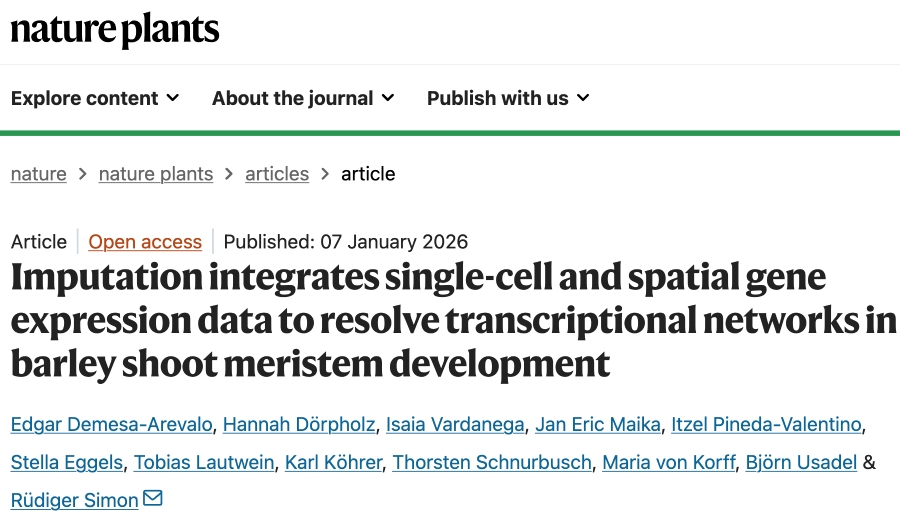 單細(xì)胞與空間轉(zhuǎn)錄組整合分析,揭示大麥從分生組織及器官起始細(xì)胞命運(yùn)決定到特定花器官起始過(guò)程中的關(guān)鍵轉(zhuǎn)錄事件與時(shí)空軌跡 http://m.justbox.cn/archives/35702 Tue, 10 Feb 2026 09:05:39 +0000 http://m.justbox.cn/?p=35702 2026年1月7日,Nature?Plants在線發(fā)表了來(lái)自德國(guó)杜塞爾多夫海因里?!ずD髮W(xué)的Rüdiger?Simon團(tuán)隊(duì)的研究論文:“Imputation?integrates?single-cell?and?spatial?gene?expression?data?to?resolve?transcriptional?networks?in?barley?shoot?meristem?development”。