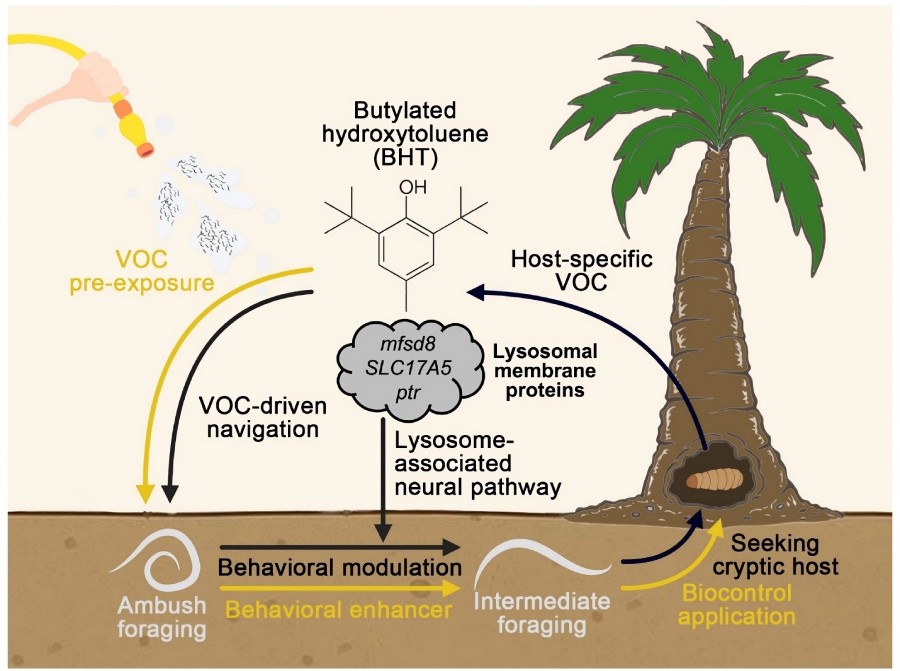 在機(jī)制層面,研究進(jìn)一步從行為調(diào)控角度出發(fā),通過(guò)對(duì)暴露于BHT的線蟲進(jìn)行轉(zhuǎn)錄組測(cè)序,解析了溶酶體相關(guān)神經(jīng)通路在這一過(guò)程中所起的作用。結(jié)果表明,寄主揮發(fā)物信號(hào)能夠通過(guò)影響線蟲體內(nèi)相關(guān)轉(zhuǎn)運(yùn)系統(tǒng)與代謝狀態(tài),進(jìn)而改變其神經(jīng)活動(dòng)與行為輸出。研究成功將化學(xué)信號(hào)、能量代謝與行為響應(yīng)建立起關(guān)聯(lián),體現(xiàn)了從生態(tài)現(xiàn)象到生理調(diào)控的跨層級(jí)認(rèn)知整合。在應(yīng)用基礎(chǔ)層面,該研究為生物防治技術(shù)的發(fā)展提供了新的思路。通過(guò)利用寄主揮發(fā)物或模擬信號(hào)對(duì)線蟲進(jìn)行“生態(tài)預(yù)激”?,可實(shí)現(xiàn)對(duì)生防線蟲行為的精準(zhǔn)調(diào)節(jié),從而提升其在隱蔽性或鉆蛀型害蟲(如紅棕象甲、番茄潛葉蛾等)防控中的效率,減少化學(xué)農(nóng)藥依賴,推動(dòng)農(nóng)業(yè)綠色發(fā)展。這一成果不僅拓展了生物防治的技術(shù)邊界,也為農(nóng)業(yè)生物安全提供了新的科學(xué)支撐。