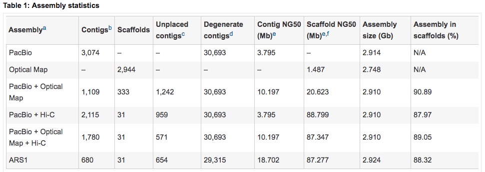 話說(shuō)回來(lái),既然是技術(shù)貼,咱們還是先來(lái)看看組裝策略吧。簡(jiǎn)單的說(shuō),組裝的方針就是用三代單分子組裝到contig,基于光學(xué)圖譜構(gòu)建scaffold,之后在用HIC構(gòu)建染色體版scaffolds,然后基于RH群體構(gòu)建的遺傳圖去矯正之前組裝的錯(cuò)誤,最后基于二代短reads補(bǔ)gap。具體的組裝軟件及參數(shù)在文章中的都很明了,小編在此就不贅述了。效果么,直接上表!
