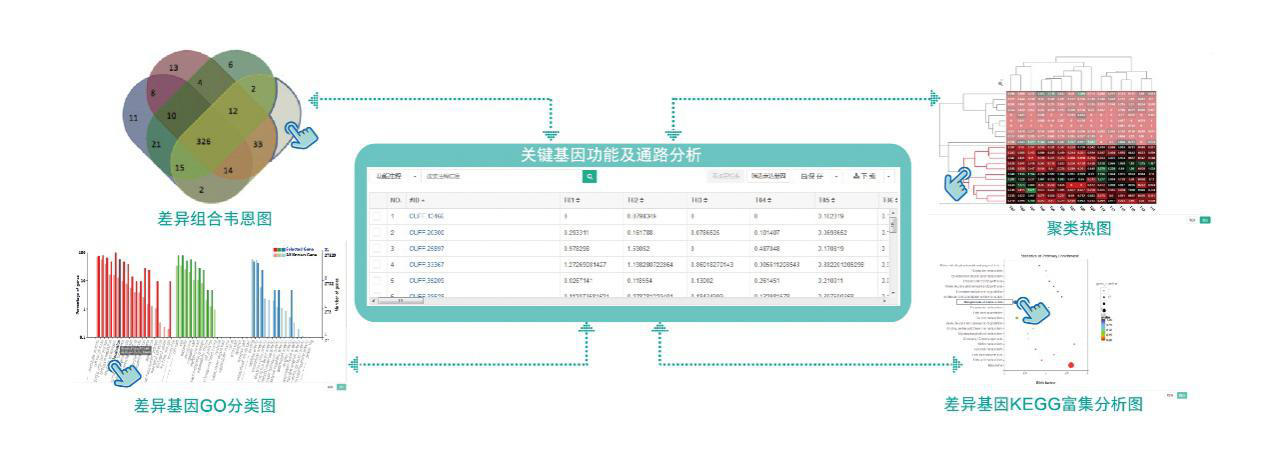 答:可從所有基因,差異基因及SNP三個方面進行數(shù)據(jù)挖掘。所有基因可通過功能注釋信息,基因ID,基因名稱,序列信息幾個方面進行挖掘,同時還可以做表達基因集維恩圖,WGCNA等分析。差異基因則可通過維恩圖分析不同處理批次幾個差異組合共同的差異基因;通常表達量變化趨勢一致的基因,可能會有相似的功能,故可通過基因共表達趨勢分析來進行差異基因的深入挖掘。SNP則可通過PCA分析,系統(tǒng)進化樹,樣品間差異SNP篩選及目標區(qū)域SNP查詢等進行挖掘。以上這些分析均可在我公司云平臺免費完成。
