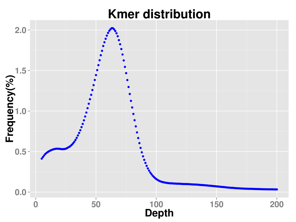 由于基因組存在雜合位點和重復(fù)序列,k-mer曲線往往不會呈現(xiàn)出良好的泊松分布,而是在主峰前后出現(xiàn)其他的峰,如果存在一定雜合度,會導(dǎo)致在主峰對應(yīng)的橫坐標(biāo)的二分之一處出現(xiàn)雜合峰,而一定的重復(fù)度則會在主峰對應(yīng)的橫坐標(biāo)的整數(shù)倍處出現(xiàn)重復(fù)峰。