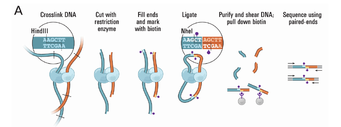 Hi-C技術(shù)是染色質(zhì)構(gòu)象捕獲技術(shù)( Chromosome conformation capture )與高通量測(cè)序( High-throughput sequencing )結(jié)合衍生的一種技術(shù)。主要是利用全基因組范圍內(nèi)整個(gè)染色質(zhì)DNA在空間位置上的關(guān)系,對(duì)染色質(zhì)內(nèi)全部DNA相互作用模式進(jìn)行捕獲,結(jié)合生物信息學(xué)方法,來(lái)獲得染色體水平的基因組序列并得到染色質(zhì)三維結(jié)構(gòu)信息。此外還可以并與Chip-seq、轉(zhuǎn)錄組數(shù)據(jù)聯(lián)合分析,從基因調(diào)控網(wǎng)絡(luò)和表觀遺傳網(wǎng)絡(luò)來(lái)闡述生物體性狀形成的相關(guān)機(jī)制。