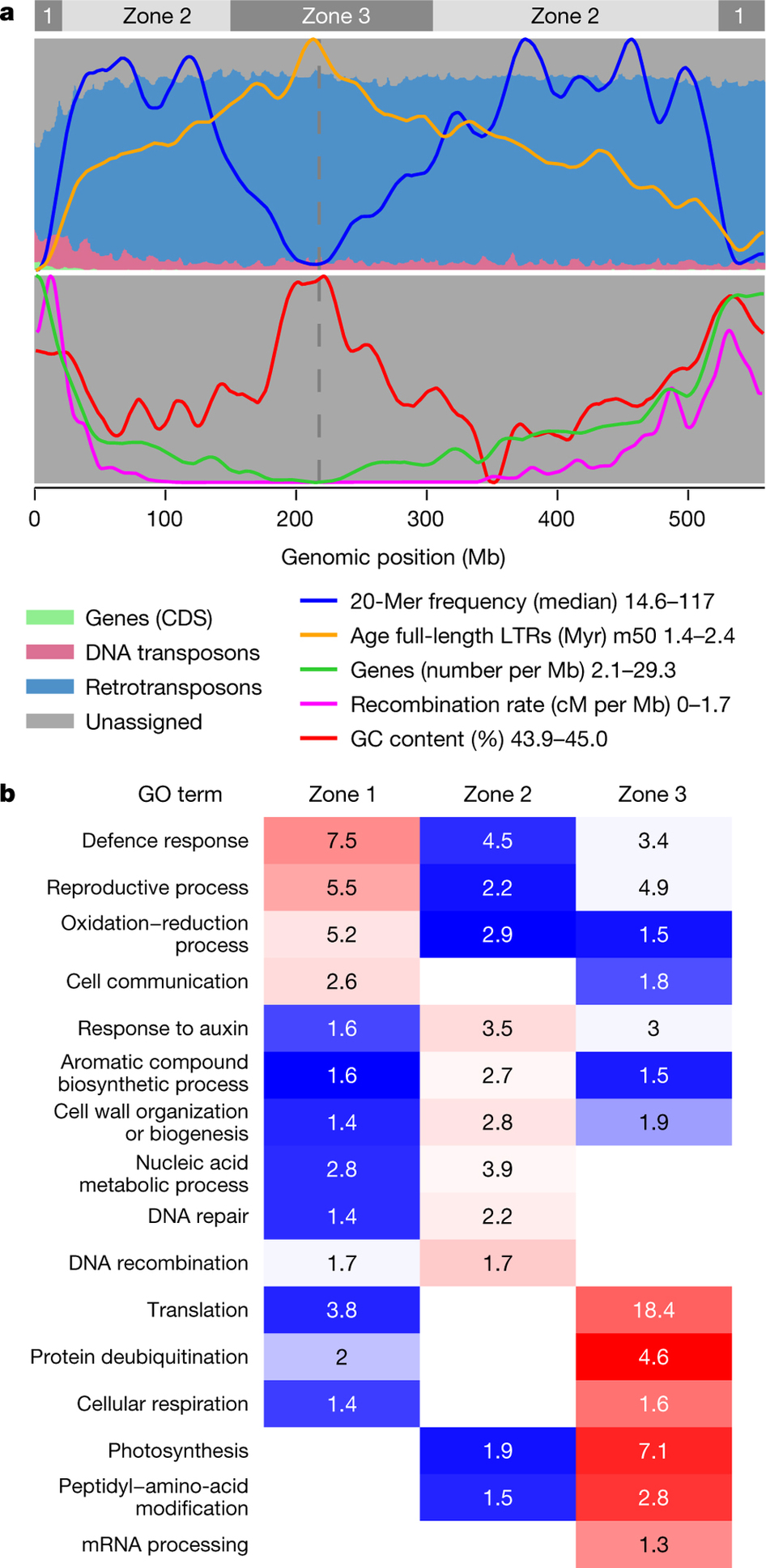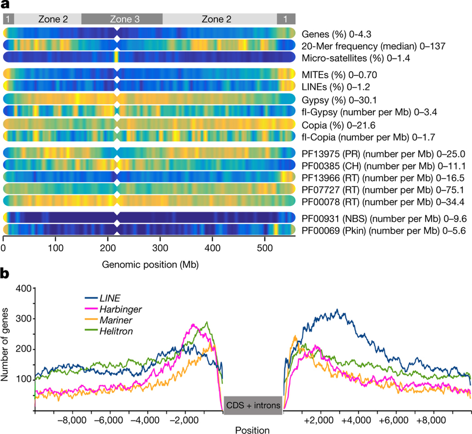 利用染色體位置信息,通過(guò)對(duì)20-mer頻率將染色體進(jìn)行劃分成了三種區(qū)域,每種區(qū)域上在基因密度,重組率,LTR插入時(shí)間以及GC含量上都存在一定的規(guī)律。