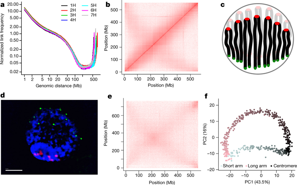 通過(guò)HIC熱圖作者發(fā)現(xiàn)無(wú)論是染色體內(nèi)部還是染色體間的長(zhǎng)短臂之間都存在較強(qiáng)的交互信號(hào)。按照HIC的原理來(lái)說(shuō),染色體上空間作用越強(qiáng)則實(shí)際DNA間的物理距離越近,染色體大小臂及不同染色體間的相互作用應(yīng)該是極弱的。為了找出原因,作者通過(guò)對(duì)大麥葉核間期的細(xì)胞進(jìn)行著絲粒及端粒熒光雜交,發(fā)現(xiàn)所有染色體的端粒和著絲粒在空間上的位置都純?cè)跇O性,且排列方式也極其相似,不同染色體間的大小臂其實(shí)在空間上距離很近,因此確實(shí)存在染色體內(nèi)外大小臂之間大量的交互作用的可能。