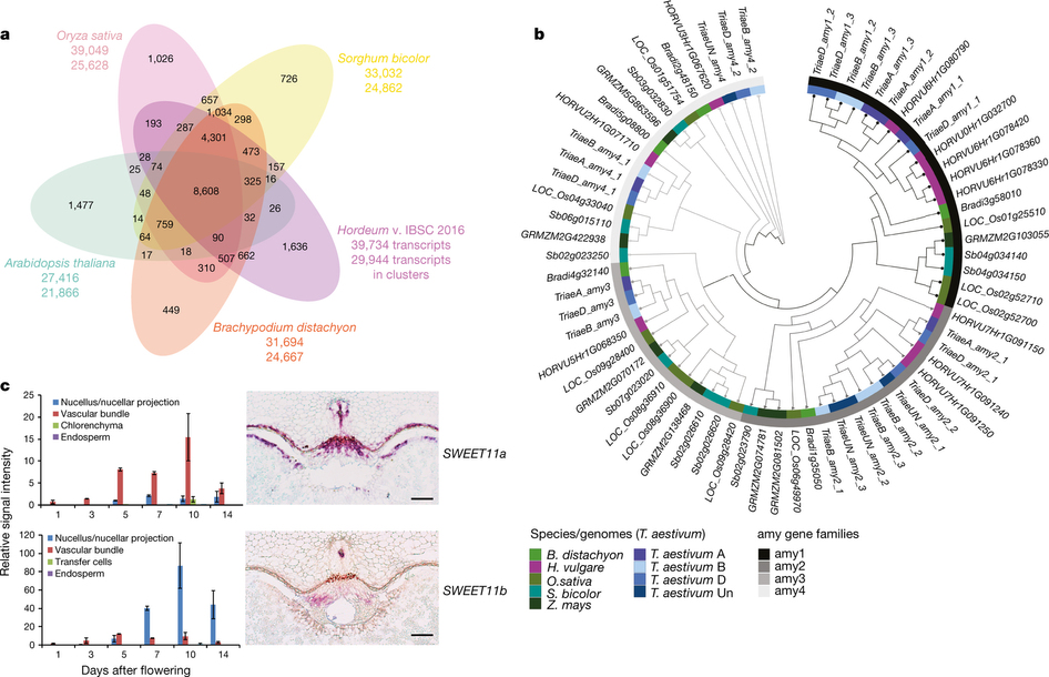 通過(guò)對(duì)大麥基因組進(jìn)行基因家族收縮擴(kuò)張分析發(fā)現(xiàn),收縮擴(kuò)張的家族中*顯著的部分都與植物防御及抗病相關(guān)。另外,作者對(duì)麥芽品質(zhì)相關(guān)的amy家族及糖代謝相關(guān)的SWEET家族進(jìn)行了亞家族分類,多倍化及表達(dá)模式相關(guān)的分析。