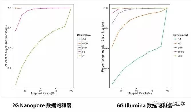 針對同一樣本進行的飽和度分析顯示,2G ONT全長除表達量極低的(CPM<1)其他轉錄本都達到飽和了,和二代Illumina 6G除表達量極低FPKM<1外的基因檢測也飽和了,且前者更早趨向飽和;