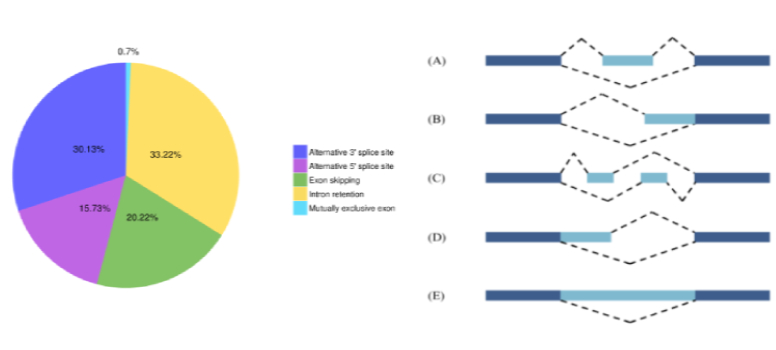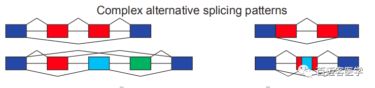基因轉錄生成的前體mRNA(pre-mRNA),有多種剪接方式,選擇不同的外顯子,產生不同的成熟mRNA,從而翻譯為不同的蛋白質,構成生物性狀的多樣性。這種轉錄后的mRNA加工過程稱為可變剪接或選擇性剪接(Alternative splicing)??勺兗艚宇愋桶ǎ?A) 外顯子跳躍;(B) 可變轉錄終止位點;(C) 可變外顯子;(D)可變轉錄起始位點;(E) 內含子保留。