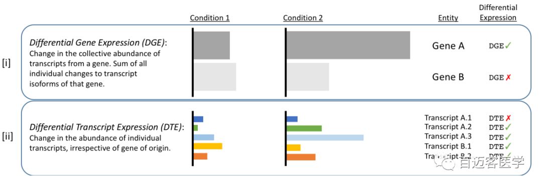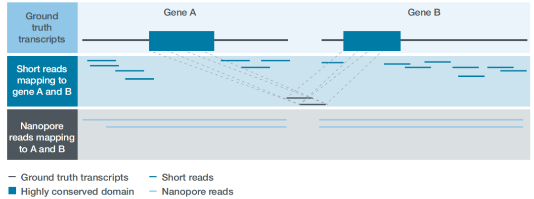 注:上圖中藍色方塊表示測到RNA序列中能夠比對到基因組序列的區(qū)域,即屬于某個轉錄本外顯子區(qū)的reads;灰色線條表示我們測到的reads回比基因組序列時中間沒有比對上的,則用灰色線條連接,即reads不連續(xù)比對,中間被剪接掉的內含子區(qū)。從圖中明顯看出,二代短reads比較短,多數(shù)短read單條連一個外顯子區(qū)都跨越不了,nanopore長讀長測序可以直接得到3種全長轉錄本。其中,Exon2和Exon6以及Exon9是三個轉錄本間共享的,那么對于完全比對到這3個外顯子區(qū)的短reads無法區(qū)分其來源轉錄本。而三代測序則直接跨越三個全長轉錄本,因此對于轉錄本水平表達定量更準確。