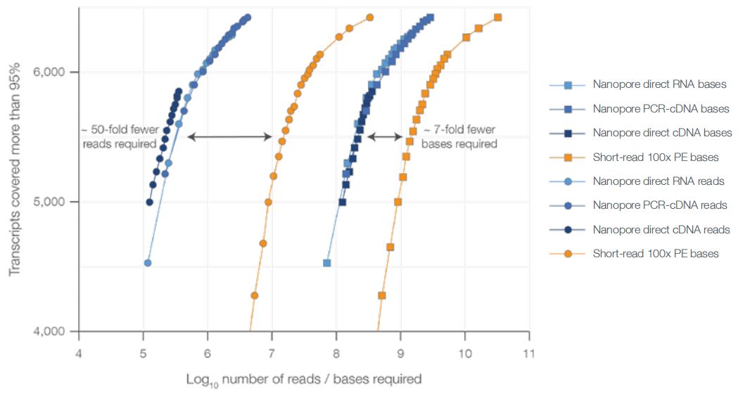 ONT全長轉錄組測序一條reads即代表該轉錄本表達一次,而二代短reads需要非常多條才能覆蓋一個轉錄本;oxford nanopore公司官方白皮書中數(shù)據顯示:當相同數(shù)量的轉錄本被覆蓋達95%時,ONT所需要的reads數(shù)比Illumina約少50倍,所需要堿基數(shù)約少7倍。