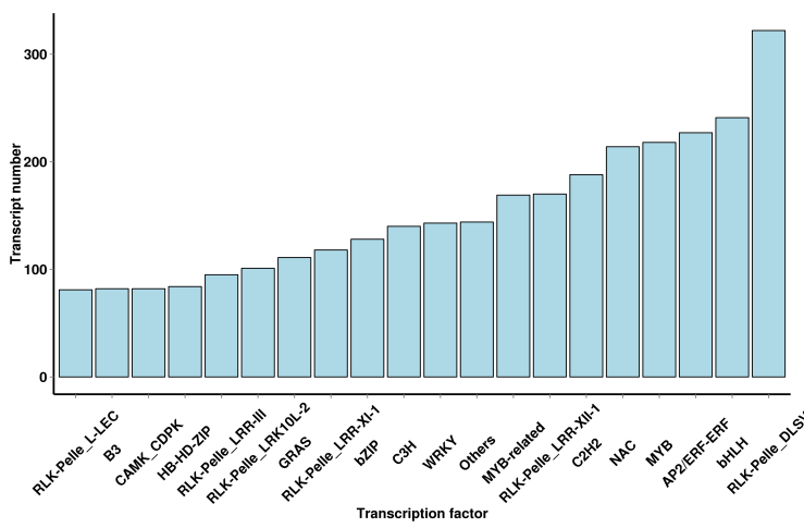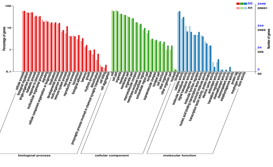 GO注釋分類統(tǒng)計圖,直觀的反映出在生物過程(biological process)、細胞組分(cellular component)和分子功能(molecular function),可深入挖掘差異基因和轉錄本的功能及所在的信號通路,篩選關注差異基因和轉錄本注釋情況。