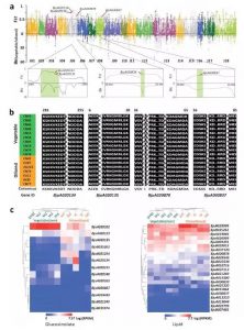 我們對10個菜用的芥菜、7個油用的芥菜,5個甘藍(lán)型油菜基因組、27個白菜基因組(多亞種)進(jìn)行了重測序分析,并繪制如上圖b中的進(jìn)化樹。從b圖中可以看到芥菜全部聚在一起,沒有出現(xiàn)分散的情況,說明芥菜中A的基因組是來源于同一個亞種,屬于單系起源。