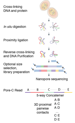 通過甲醛將基因組DNA與組蛋白交聯(lián),保持相互作用位點的空間鄰近性。鄰近連接后進行限制性酶切。將交聯(lián)、相互作用的片段連在一起,這些片段經(jīng)過大小選擇和文庫制備后基于Nanopore測序平臺進行長片段測序。