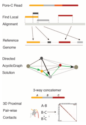 Pore-C是指將染色質(zhì)構(gòu)象捕獲技術(shù)與Nanopore長讀長測序技術(shù)結(jié)合,無需擴增直接檢測多向染色質(zhì)交互信息的一種新技術(shù)。該技術(shù)除了像Hi-C一樣能確定成對基因組結(jié)構(gòu),還可以直接測量細胞內(nèi)同時相互作用的多個DNA區(qū)域互作信息(higher-order)。