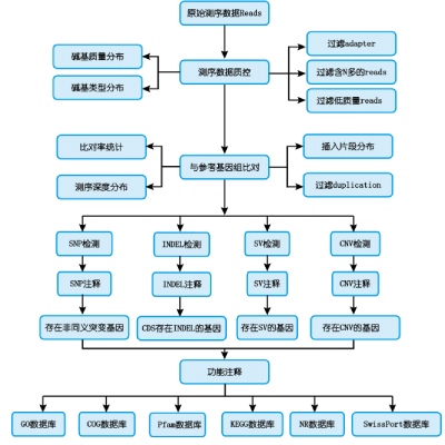 全基因組重測序(whole genome sequencing,WGS)對全基因組進行測序掃描,能在全基因組范圍之內解讀所有常見和稀有變異信息,全面檢測單核苷酸多態(tài)位點(Single Nucleotide Polymorphisms, SNP)、插入缺失位點(Insertion Deletion, InDel)、結構變異(Structure Variation,SV)以及拷貝數(shù)變異(Copy Number Variation, CNV)。