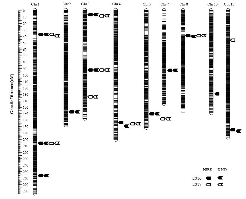 High-density linkage map based on genotyping-by-resequencing showing the most likely positions of QTLs for grain protein content measured by NIRS and KND methods in population.