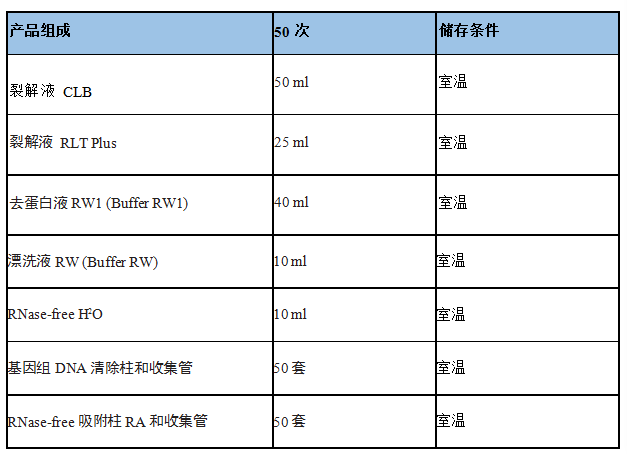 該試劑盒中的裂解液RLT Plus能迅速裂解細(xì)胞和滅活細(xì)胞RNA酶的活性;且基因組清除柱能有效分離上清液并去除gDNA。提取的RNA純度高、質(zhì)量穩(wěn)定。適用于從動(dòng)物組織、細(xì)胞樣本中快速提取總RNA。